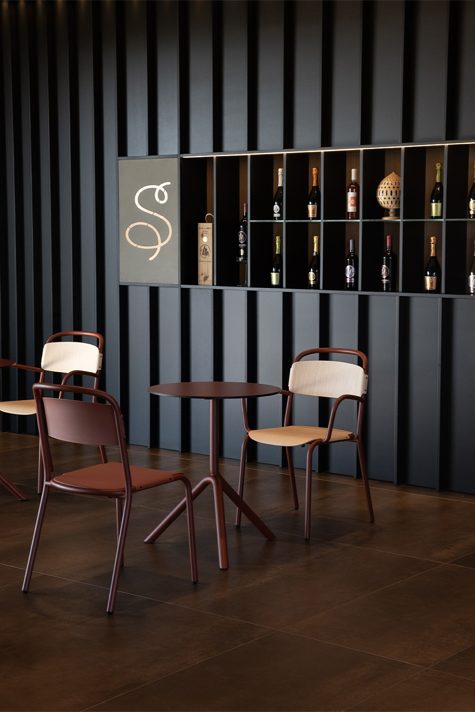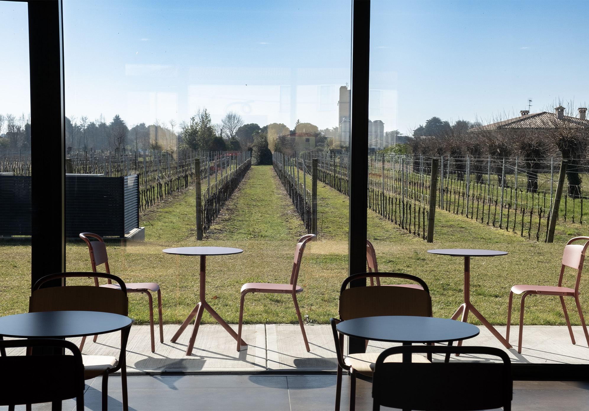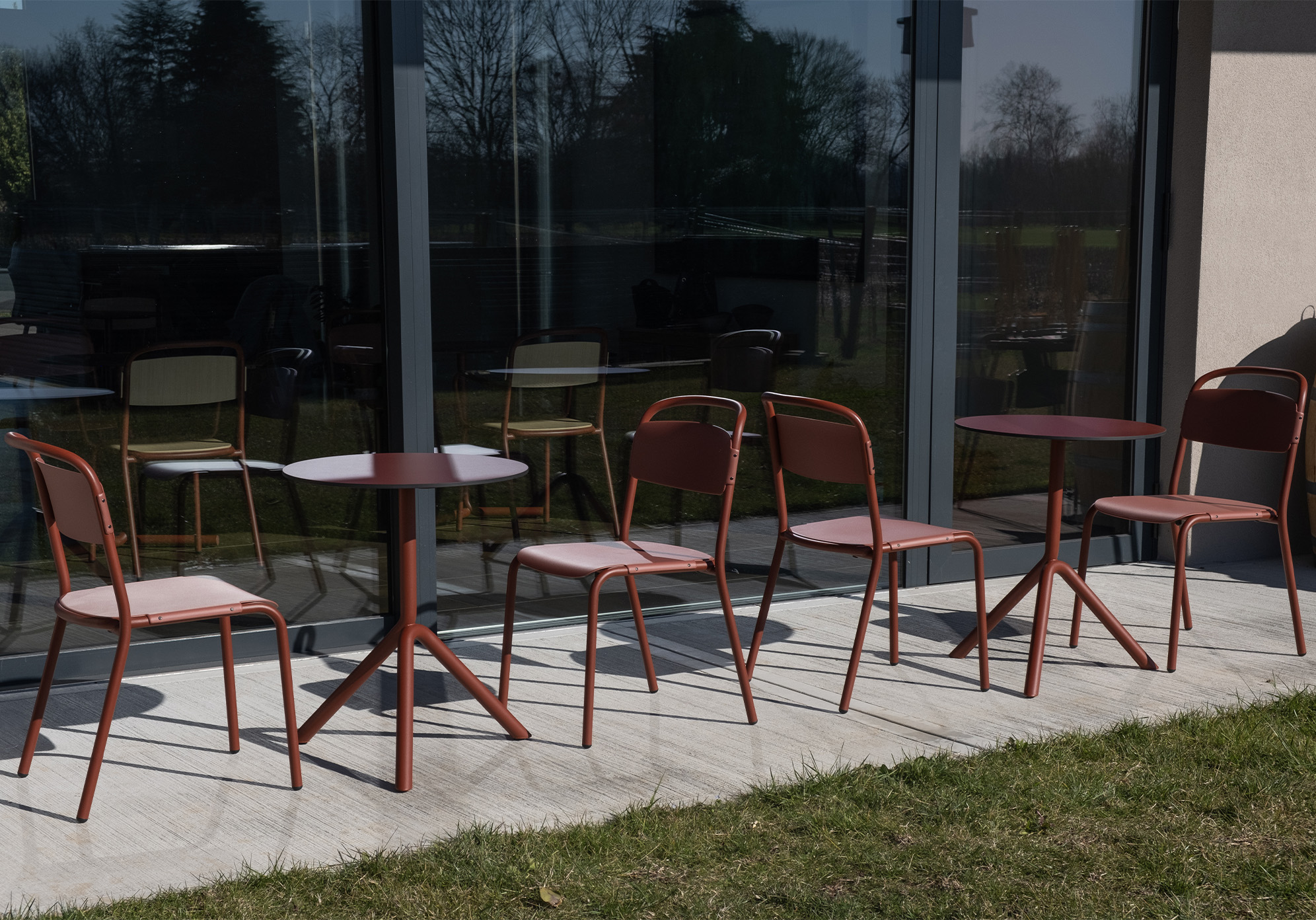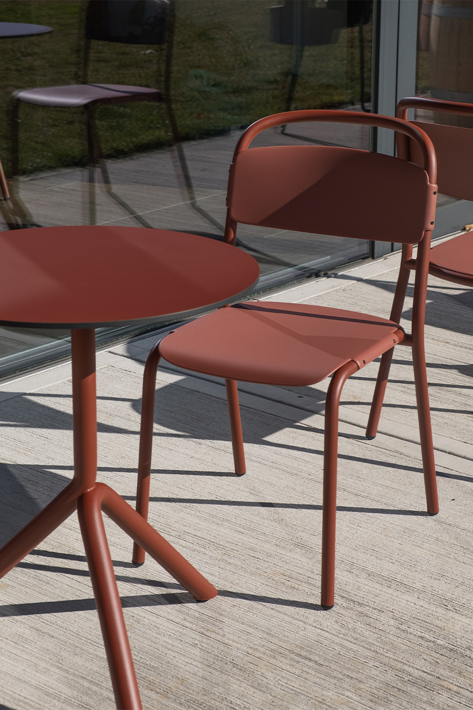La colección de mesas Jit se creó pensando en formas sencillas pero funcionales. Un marco de tubos de acero de generosas dimensiones se compenetra con una sección circular curvada adicional, que parece descansar suavemente sobre sí misma. Jit está disponible con dos tipos de base diferentes: con tres patas en el suelo, con pies fijos o ajustables en tres alturas, o con una base piramidal, en altura de barra o de cocina y con un mecanismo superior reclinable opcional; en esta versión, es posible el apilamiento horizontal “nesting”.