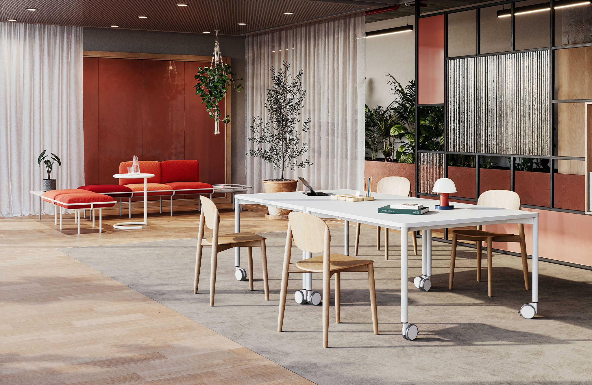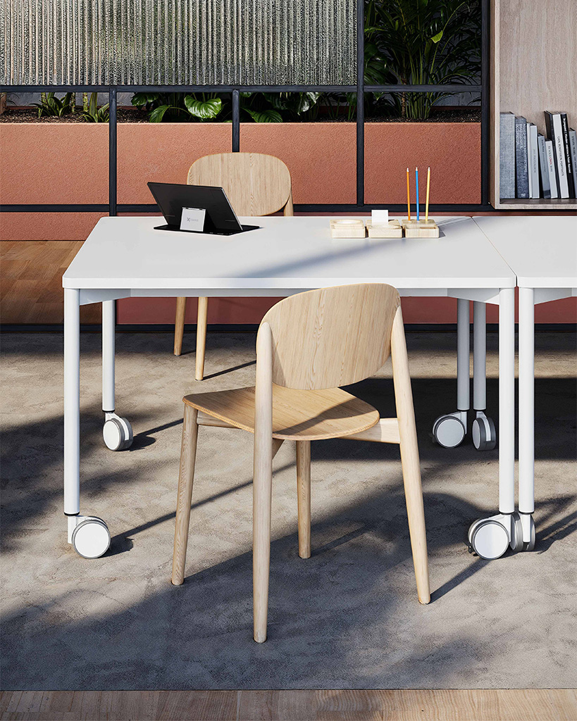 La colección incluye elementos en dos alturas: el clásico escritorio para el trabajo concentrado y las reuniones estructuradas, y Meeting, mesas altas con reposapiés integrados, concebidas para crear estaciones de trabajo inteligentes en coworking, bares o cafeterías, así como para encuentros informales o el trabajo de pie.
