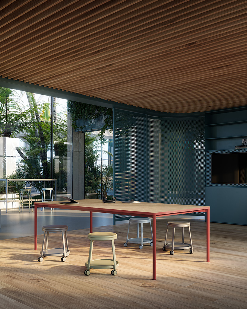 La colección incluye elementos en dos alturas: el clásico escritorio para el trabajo concentrado y las reuniones estructuradas, y Meeting, mesas altas con reposapiés integrados, concebidas para crear estaciones de trabajo inteligentes en coworking, bares o cafeterías, así como para encuentros informales o el trabajo de pie.